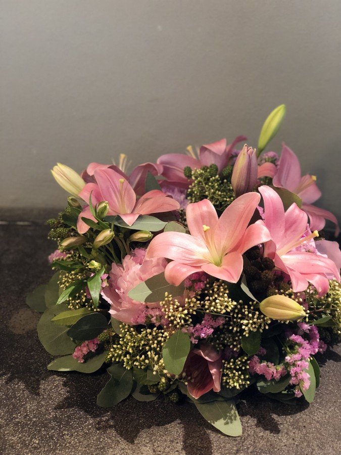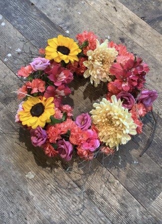 Unsere Frischblumenkränze werden je nach Jahreszeit mit den schönsten Blüten der Saison gestaltet.